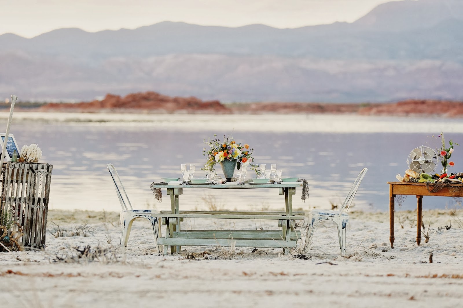 we were fortunate enough to team up with some amazing southern utah wedding vendors for this seaside inspired styled shoot at sand hollow. the details were refreshing and mother nature provided some stunning flowers for us to use. some of them included french lavender, shades of orange ranunculus, the most amazing light yellow dahlias (very rare) purple gomphrena, pale pink lisianthus, light blue tweedia, white veronica, silver dollar eucalyptus, green pierus and rosemary. the bride's bouquet was wild & organic and the groom's boutonniere we kept simple with just a touch of greenery. enjoy these whimsical and nautical photos!